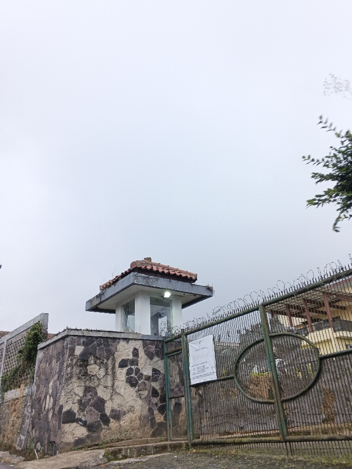 The image displays the entrance to a property in Kampong Chhnang, Cambodia, under an overcast sky. A white, elevated security booth with a red-tiled hip roof and glass-paneled walls is visible, positioned atop a multi-toned stone wall on the left. An interior light source is active within the booth. In front of the wall and booth is a dark green metal gate constructed from vertical bars, featuring two prominent circular decorative elements. The upper edge of the gate is secured with razor wire. A white rectangular sign with dark text is affixed to the central upper section of the gate. Partially visible behind the gate and wall, on the right, is a multi-story building with yellow-beige exterior walls and visible balconies. Minimal green foliage is present in the upper right quadrant of the frame. No individuals are depicted.