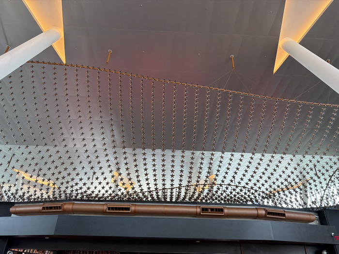 An upward-angled interior view depicts architectural and artistic installations within George Bush Intercontinental Airport (IAH) in Houston, Texas, USA