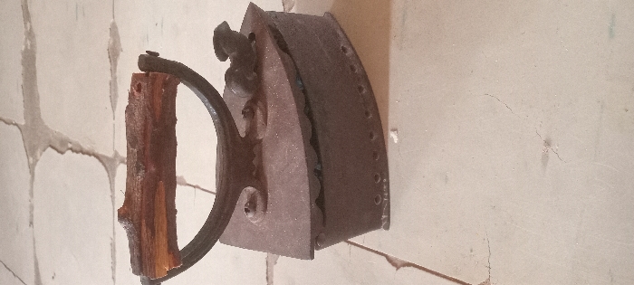 An old, rusty metal iron sits against a cracked, off-white wall