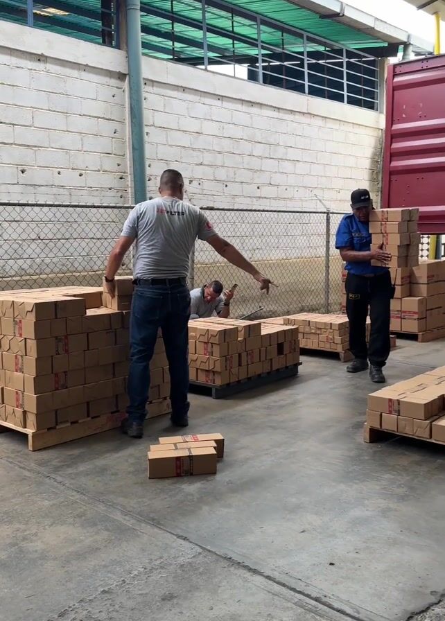 Several workers are loading cardboard boxes into a shipping container attached to a truck. The container is painted red on the outside, while the truck is orange and yellow. The boxes are small and uniform, with a red stripe. The workers are stacking them on pallets, with some already loaded onto the truck bed. The loading takes place in a warehouse with a gray concrete floor and a high ceiling covered in green corrugated metal. The exterior walls of the warehouse are constructed from gray bricks, and a chain-link fence separates a section of the warehouse from the loading area. One person is seen taking pictures. The license plate on the truck reads "A38BL8S."