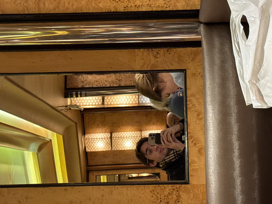 A selfie captures two people in a mirror, set against a wood-paneled background