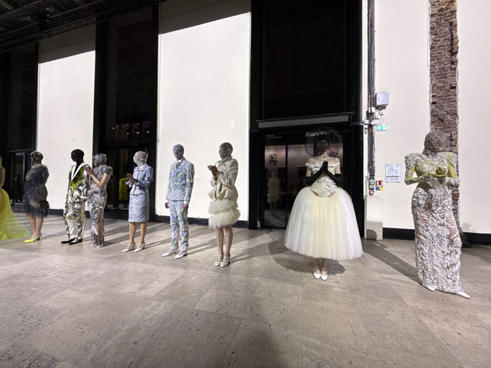A runway scene features ten figures in ornate, surreal couture. Most models stand in a line, some clapping, clad in patterned suits, dresses with feathers or embellishments, and face coverings that obscure their features. Two figures stand apart, one in a voluminous tulle skirt and lace bodice with a large headpiece, hands clasped in prayer, and the other in a full-length textured gown, holding a small object. The backdrop includes tall white panels, a dark doorway, and exposed brick, creating a theatrical and unsettling atmosphere.