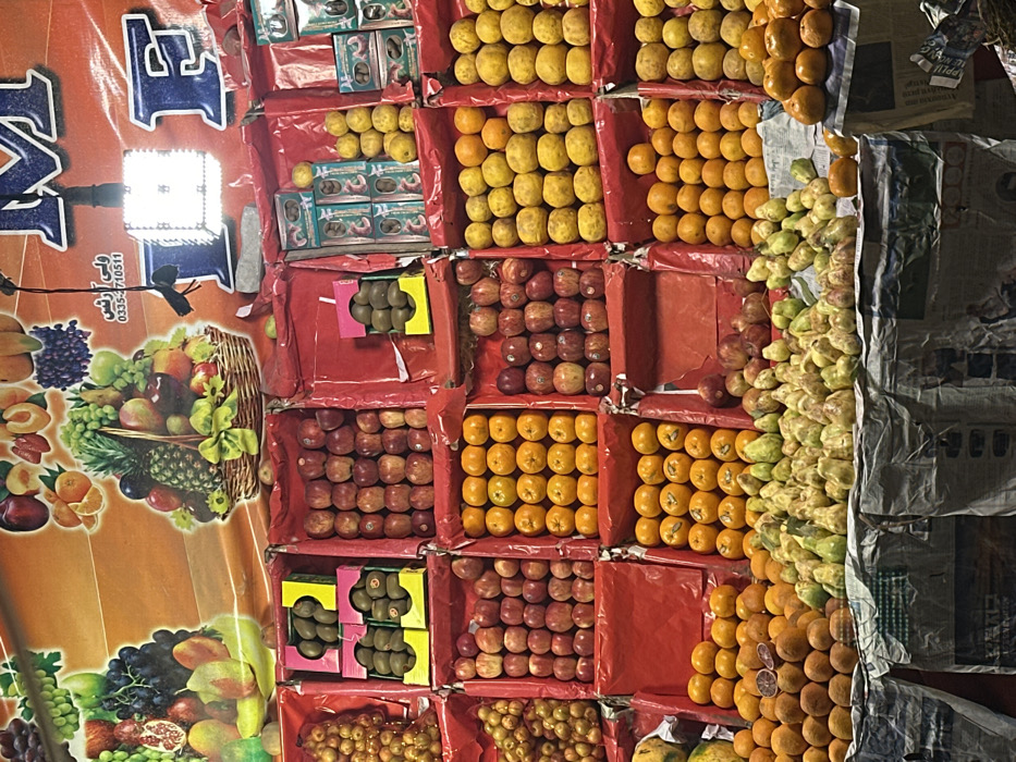 Red crates filled with fruits are stacked. Apples, oranges, mangoes, kiwis, and some golden, pear-shaped fruits are arranged neatly in rows. Some crates are lined with newspaper. A bright light shines on the left. A shop’s banner with an illustration of fruits and text is visible in the left corner.