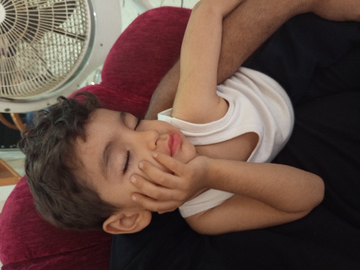 An image shows a young male child asleep indoors in Rukn ad-Din Municipality, Syria. The child, possessing medium skin tone and dark brown curly hair, is attired in a white sleeveless undershirt and dark trousers or shorts. His eyes are closed, and his right hand rests against his right cheek. He is positioned atop an adult's limb, with a dark-skinned, hairy forearm visible beneath the child's left arm. A dark red upholstered surface is visible behind the child. In the upper right background, a stationary white electric fan with a protective grille is partially visible.