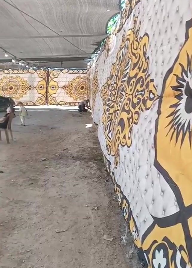 n open-air parking lot, partially covered by a gray shade structure with suspended lights. Along one side is a decorative wall with a patterned fabric. In the lot, there are parked cars and plastic chairs. Several people are visible, some sitting, some walking. Across the open lot, a building with arched entrances is visible, with people entering and sitting inside. The ground is dirt and gravel. The video is handheld, and the view pans across the scene.