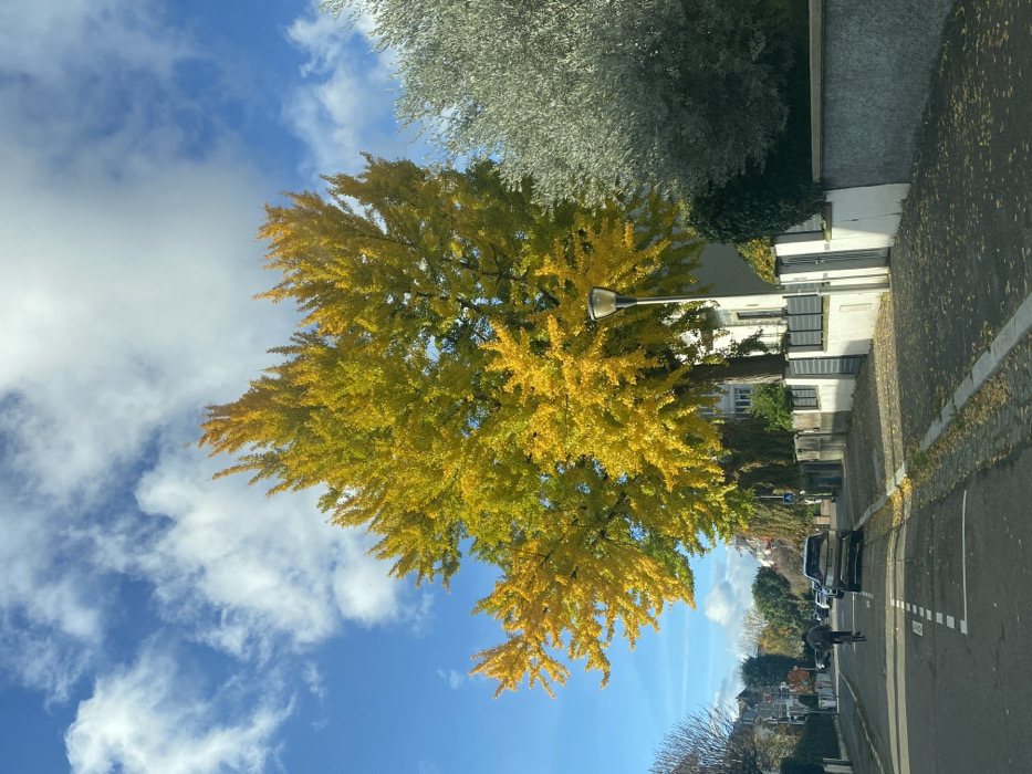 This image depicts a sunlit residential street scene in Strasbourg, France, characterized by autumn foliage. The sky is blue with scattered white cumulus clouds. In the foreground and central-right, a large deciduous tree with vibrant golden-yellow leaves, indicating autumn, dominates the frame. A streetlamp with a dark, inverted-cone-shaped light fixture on a silver pole stands beneath this tree, adjacent to a paved sidewalk. The sidewalk is partially covered with fallen golden leaves. To the far right, a portion of another tree or large bush with silvery-green foliage is visible. Along the right side of the street, behind the golden tree and sidewalk, are residential buildings with white or light-colored facades, protected by various fences and gates. The asphalt road features a white dashed line in the foreground, suggesting a lane marking. Further down the street, on the left side, a person wearing a dark jacket is riding a bicycle away from the viewer. Several parked vehicles are visible further down the left side of the street, including a light-colored SUV. Other houses and trees, some with sparse leaves, line the left side of the road in the distance. The lighting suggests a clear day, likely during the morning or afternoon.