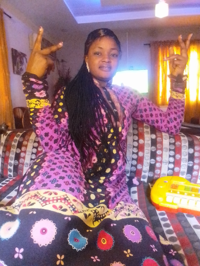 A single adult female is seated on a multi-patterned sofa in an indoor residential setting, likely a living room, located in Unknown, Unknown. She directly faces the camera, exhibiting a slight smile. Her dark hair is styled in micro braids extending past her shoulders. She wears long, dangle earrings. Her attire consists of a long, patterned garment featuring magenta, black, and yellow sections with various floral and geometric motifs. Her left hand is raised, fingers forming a "V" sign, while her right hand is also raised, displaying a similar "V" gesture but with middle and ring fingers bent, and adorned with multiple bracelets. The sofa she occupies features a striped pattern of black, red, and white, with silver circular embellishments. In the background, to the left, a brown patterned curtain and a framed wall hanging are visible. To the right, a wall-mounted flat-screen television displays a light image, with sheer yellow curtains behind it. Ceiling lights, including a blue-emitting recessed light and a white pendant fixture, are visible above. A yellow plastic toy, resembling a miniature keyboard with white keys and colored buttons, rests on the sofa to the right of the woman.