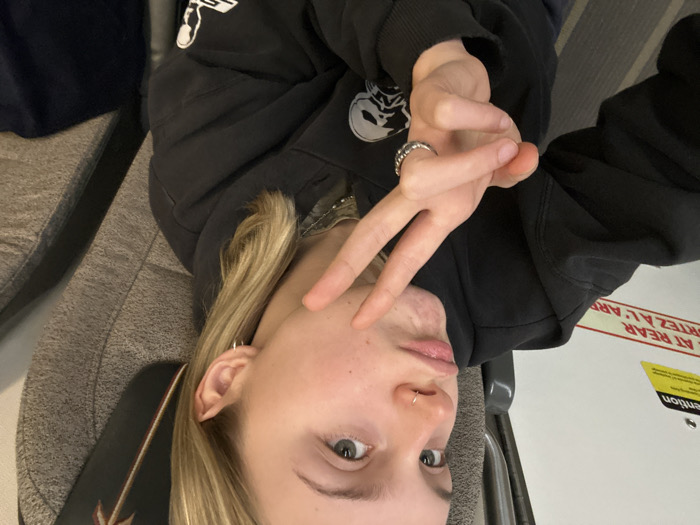 A pale-skinned person with blonde hair gestures a peace sign. They wear a black hoodie with a logo. A silver hoop earring adorns the ear, and a nose ring is visible. The person is likely seated, with the back of a gray upholstered chair and a panel with red and yellow markings in the background. The image is slightly rotated.