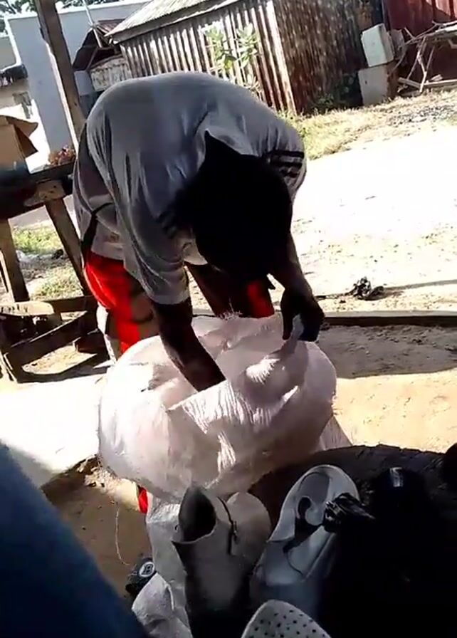 two men at a market. One man, wearing a grey t-shirt and red shorts, bends over and reaches into a large white plastic bag. There are pairs of shoes and sandals arranged on the ground near the bag. The second man, wearing a green t-shirt and jeans, is seated, and appears to be watching the first man. The setting is an outdoor market space with simple structures and buildings visible in the background.