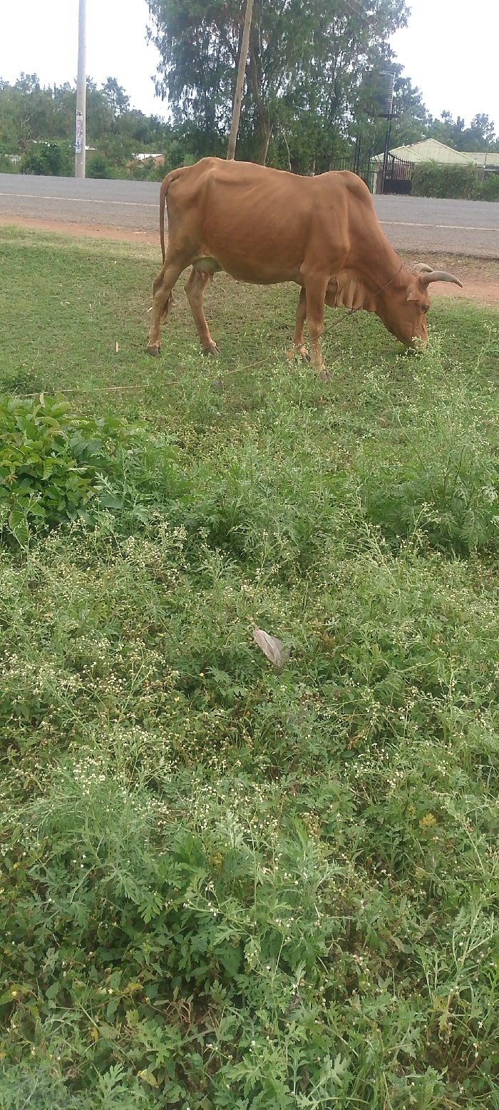 A brown cow grazes on grass near a paved road. Beyond the road, trees and a building are visible. The foreground is filled with a dense patch of weeds, some with white flowers. The cow is thin, with visible ribs, and has short horns. A leash or rope is tied to the cow's neck. The lighting suggests it's daytime.