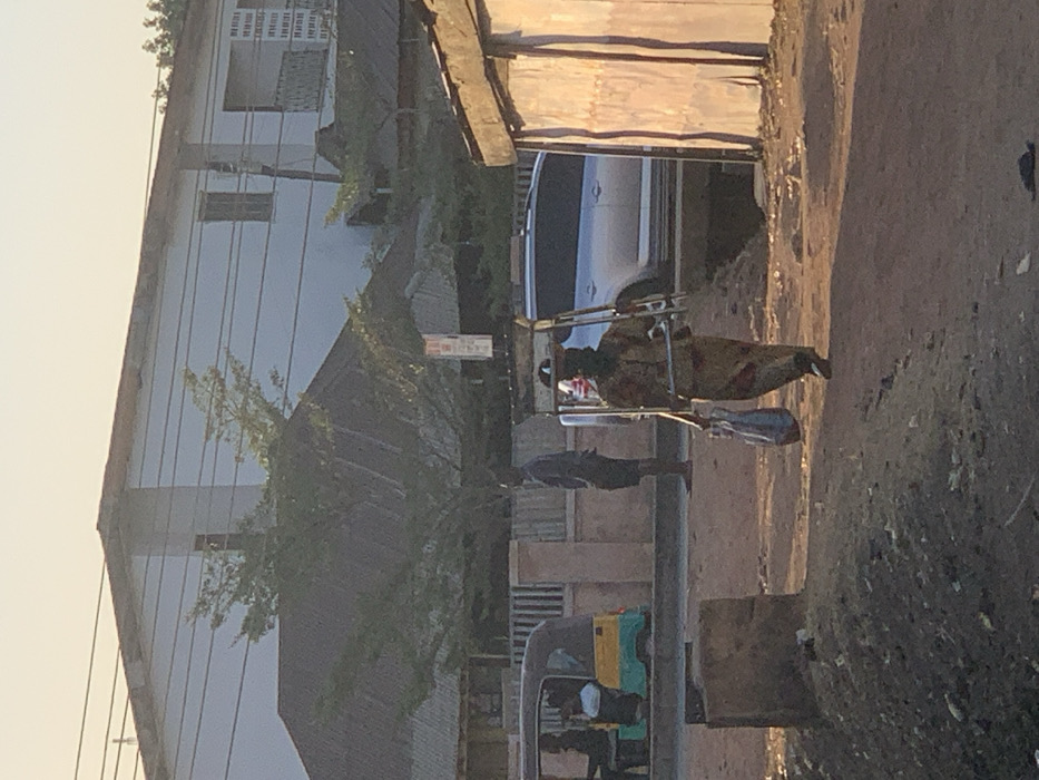 This image depicts a street scene in Jos, Nigeria, characterized by warm, low-angle sunlight, indicating either early morning or late afternoon. In the foreground, a woman walks from right to left on an unpaved, reddish-brown dirt path. She wears a patterned dress and has a dark fabric covering her head and face. On her head, she balances a metal structure, possibly a stand or rack, with two horizontal bars visible. Her left hand carries a light-colored bag. Her shadow is visible on the ground to her left. To the left of the path, a small mound of dirt and debris is present, with a concrete block-like structure partially obscured. To the right of the path, a corrugated metal structure with a weathered, light-colored surface is visible. In the midground, a paved road runs horizontally across the scene. A man, dressed in dark clothing (shirt and shorts), stands near the left edge of the paved road, facing right. Further left, a yellow, green, and black motorized tricycle (Keke Napep) is parked or moving slowly, with at least two individuals visible inside. Behind the man and Keke Napep, a fence or wall with vertical slats is present. A silver SUV is partially visible to the right of the man, on the paved road. The background features several buildings and trees. Dominating the upper background is a multi-story building with white or light-colored walls and a flat roofline. This building shows signs of multiple windows, some open, some obscured. Below and in front of this large building, multiple smaller structures with dark, corrugated tin roofs are visible, interspersed with green trees. Overhead, power lines crisscross the sky against a pale, clear sky.