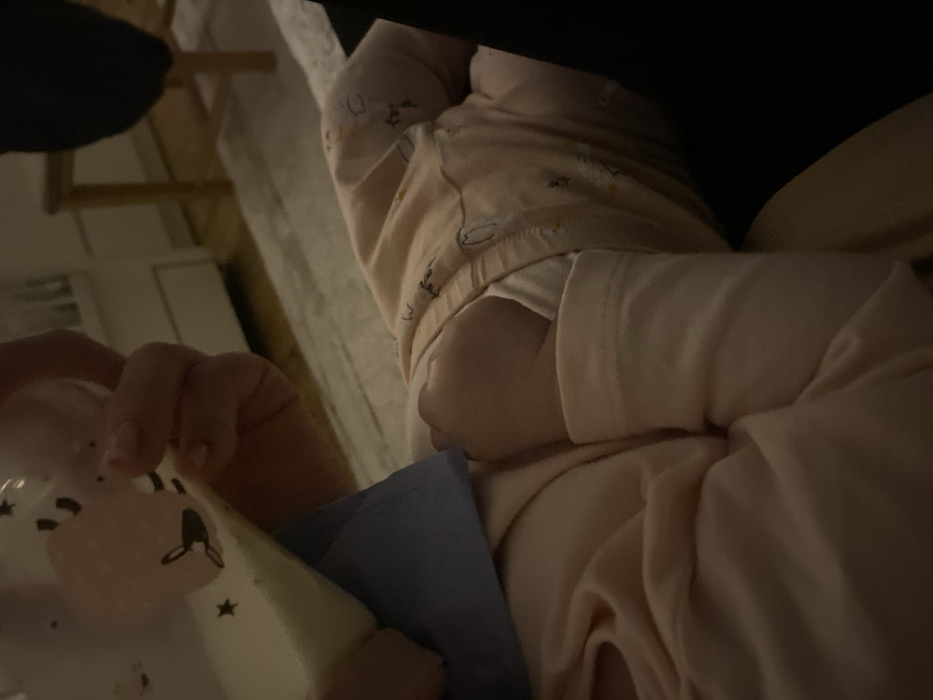 The image captures an indoor scene in Blagoevgrad, Bulgaria, under subdued, warm lighting conditions. The upper torso of an infant is visible, clad in a light pink long-sleeved garment and light peach-colored bottoms featuring small, dark patterns. A blue fabric, appearing to be a bib or burp cloth, is situated beneath the infant's chin. An unidentified individual's hand, displaying light skin pigmentation, is holding a clear baby bottle containing a white liquid, likely milk or formula. The bottle is decorated with black star and stylized animal head motifs. The infant's right arm is partially visible, with the hand curled into a loose fist. In the background, elements of a domestic setting are discernible, including a light-colored wooden chair leg, a dark chair seat, and a section of a light-toned rug or carpet laid over a wooden floor.