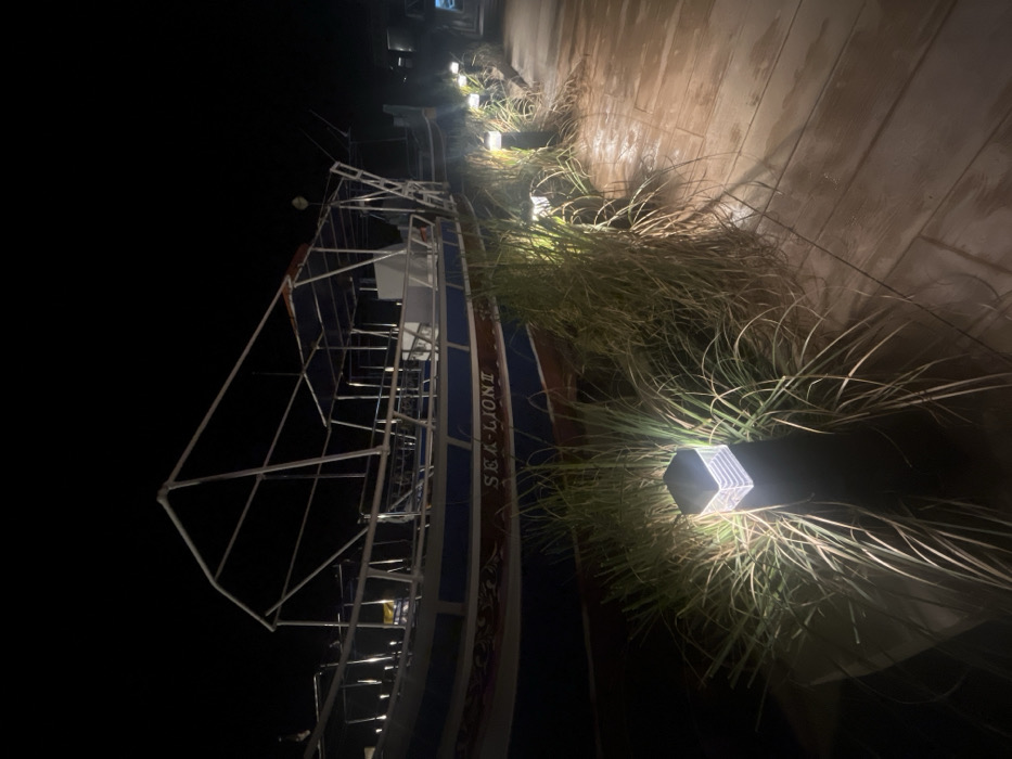 The image depicts a nighttime scene in Saint Paul's Bay, Malta. A passenger boat, identified as "SEA-LION II" by visible text on its hull, is positioned on the left side of the frame. The boat features a blue and brown/red hull with white decorative elements and a white metal frame superstructure supporting a dark blue canopy. No persons are visible on or near the vessel. To the right, a wooden boardwalk or dock, visibly wet and reflective of light, recedes into the background. Multiple square, dark-colored post lights with illuminated tops line the edge of this pathway, casting light onto the wooden surface and illuminating clusters of tall, green, reedy vegetation situated between the pathway and the boat. The sky is completely dark, consistent with a nocturnal environment.