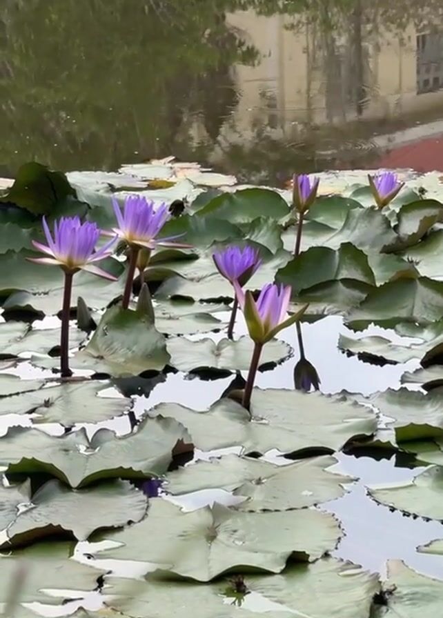 several purple water lilies blooming in a pond filled with lily pads. The water surface reflects trees and a building on the shore. The camera angle is medium-close and stationary. There are no people visible in the video.