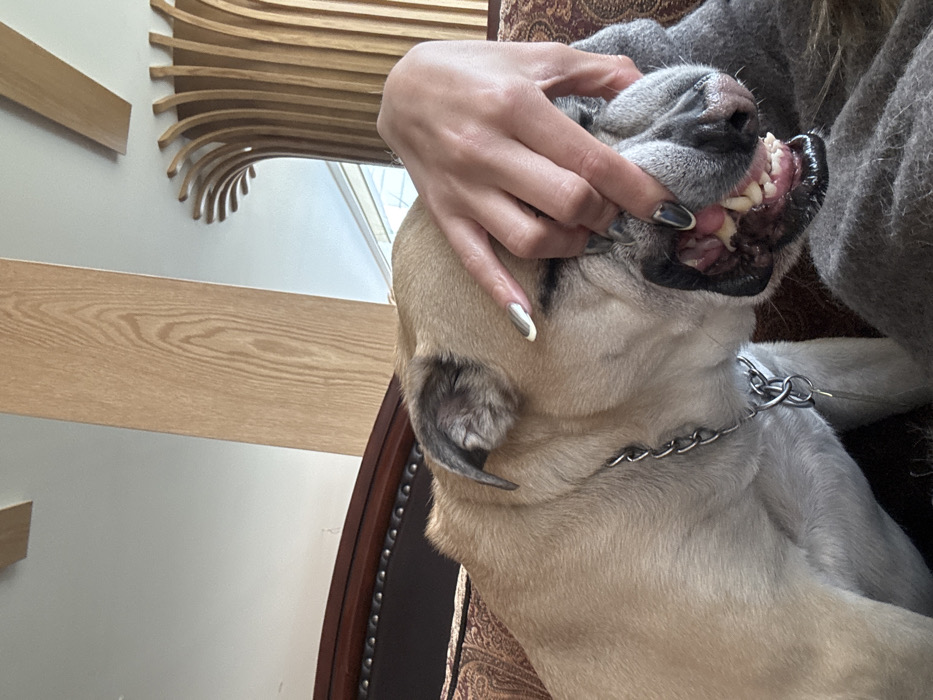 A light brown mastiff with a silver chain collar is being inspected. A person with polished nails is opening the dog’s mouth, showcasing its teeth and gums. The dog's ear is visible on the left, with a visible claw. The background includes wooden stairs and an ornate decorative wooden wall piece. Part of a patterned upholstered chair is also visible.