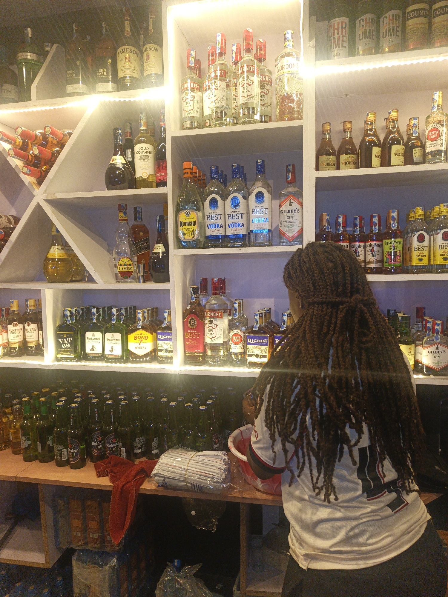 A woman with long braids stands in front of a well-stocked liquor store. The store has multiple shelves filled with various bottles of alcohol, including whiskey, vodka, gin, and beer. The woman is wearing a light-colored jersey with dark sleeves and is facing towards the shelves, likely selecting or organizing items. The shelves are illuminated with strip lighting, enhancing the visibility of the products. The bottom shelf is lined with numerous bottles of beer, mostly Heineken. The scene suggests a retail environment. The presence of "Konyagi" and "Kenya Cane" labels, along with other brands commonly found in Africa, indicates the location is likely in Nairobi, Kenya.