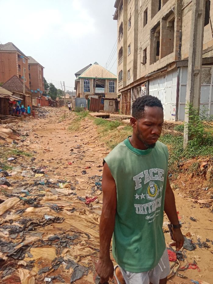 The image captures an unpaved street in Onitsha, Nigeria, under clear daylight. The street surface is composed of reddish-brown soil, heavily littered with plastic bags, fabric scraps, and other refuse, particularly dense on the left side. In the foreground, a male individual, appearing to be in his 20s or 30s, walks towards the camera, positioned slightly to the right of center. He has short, dark, curly hair and a short beard. He wears a sleeveless green t-shirt with "FACE" and "THYTHICAL" printed in white, alongside a crest emblem. He also wears light-colored shorts and a dark wristwatch on his left wrist. He holds a pair of light-colored flip-flops in his right hand. His gaze is directed downwards and to his left. On the left side of the street, a multi-story reddish-brown building with balconies is visible. Further down, smaller structures with corrugated metal roofs are present, near which a group of individuals, some in blue attire, are gathered. Utility poles with overhead wires extend along this side. On the right side of the street, a multi-story concrete building, partially constructed with exposed frames and incomplete brickwork, rises prominently. Its ground level features apparent commercial units with roll-down metal shutters. Further down, a two-story building with a light-colored, pyramidal roof and large arched windows is visible, displaying a partial sign that reads "Smart." Smaller, temporary structures made of corrugated metal are situated in front of this building. A lone individual is visible walking in the central distance, further down the unpaved road. A raised dirt bank with sparse green vegetation lines the right side of the foreground road.