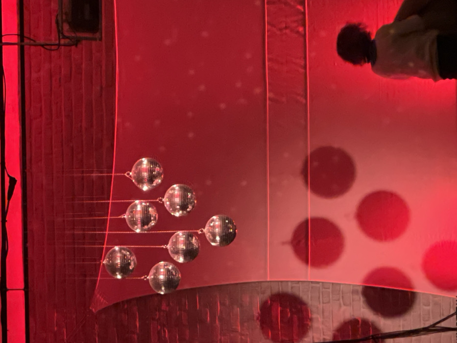 The scene depicts an interior space in Roubaix, France, characterized by intense red illumination. Eight small, spherical mirrored disco balls are suspended by individual thin lines at various heights, predominantly in the upper left quadrant of the frame. A large, curved, light-colored panel, possibly a fabric screen, is centrally positioned and extends to the right, serving as a primary surface for the red lighting. To the left of this panel, a red-illuminated brick wall is visible. Distinct circular, dark red shadows are cast onto the lower sections of both the light-colored panel and the brick wall, corresponding to the suspended disco balls. Several faint, horizontal red lines, indicative of laser projections, traverse the central panel. In the lower right, a human figure, appearing to be a child with dark, curly hair, stands facing away from the viewer, towards the illuminated panel. The figure's light-colored upper garment reflects some of the red light. In the upper right corner, a dark, rectangular object, possibly a stage light or speaker, is mounted on the red-lit brick wall.