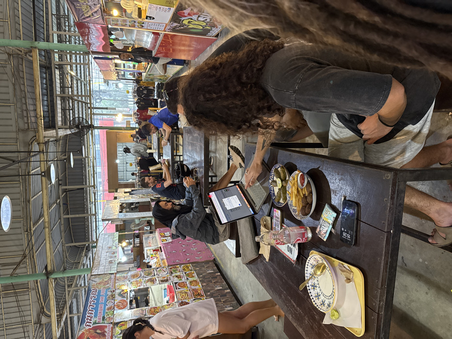 This image depicts a bustling indoor or covered outdoor food market in Moo 1, Thailand. The scene is characterized by multiple food stalls with colorful signage, predominantly in Thai script, under a corrugated metal roof supported by exposed metal beams. Overhead, several circular and linear light fixtures illuminate the area, along with a ceiling fan. In the immediate foreground, a dark wooden communal table is occupied by several individuals. On the right, a person with long, dark, curly hair, wearing a dark grey t-shirt and light shorts, is actively using a silver laptop. Their right hand is positioned on the keyboard. A black wristband is visible on their left wrist. On the same table, to the left, a bearded male wearing a dark hooded jacket sits, looking down at a small dark device held in his hands. Sunglasses are placed next to him on the table, and a grey laptop sleeve is visible nearby. His feet, clad in sandals, are partially visible. The table holds various items: a plate with falafel-like items, french fries, and a small cup of red sauce; a small plate containing sliced cucumbers; two plastic bottles (one clear, one pinkish); a dark smartphone displaying the time 15:26 and a charging icon; a small colorful packet; an empty or partially eaten bowl with a spoon and a lime wedge, resting on a yellow plastic tray; and a red menu or pamphlet. In the mid-ground, a female wearing a light-colored t-shirt or dress is standing near a food stall on the left, facing away from the camera. Further into the background, additional patrons are seated at other dark wooden tables. Two males are discernible: one in a dark t-shirt with a white "8" on it, and another in a blue polo shirt, both appearing to be engaged with their mobile phones. Various other individuals are present throughout the market, either walking or standing near the food stalls. A vendor in a white shirt and dark pants is visible behind a stall on the far right, looking towards the camera. The overall environment suggests a casual dining and work setting within a food market.