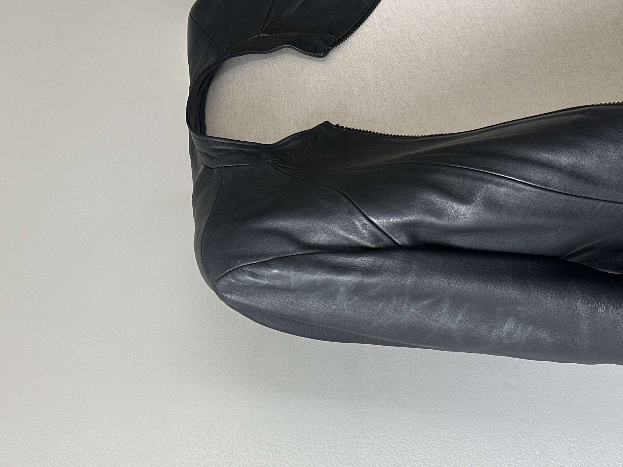 A close-up shot shows the upper portion of a black leather garment, possibly a jacket or top, draped over a mannequin