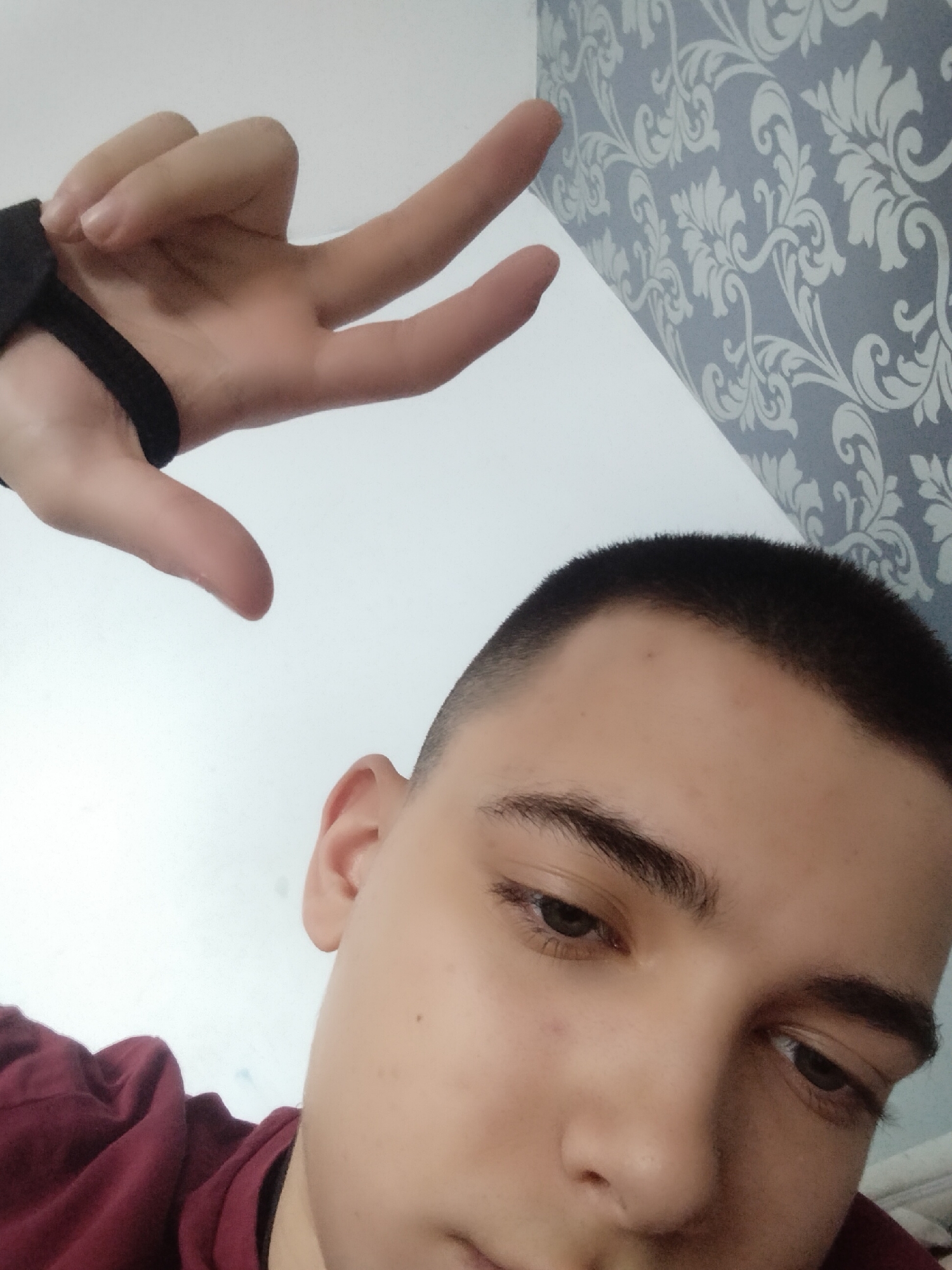 The image presents a close-up, upward-angled view of a young individual and a hand within an indoor setting in Sofia, Bulgaria. The lower right portion of the frame features the upper face and shoulder of a person with light skin, short dark hair (a buzz cut), and dark eyebrows. Their dark eyes are cast downwards. They are wearing a dark red garment. In the upper left quadrant, a light-skinned hand is positioned above the person's head, displaying the index and middle fingers extended to form a V-shape, while the thumb, ring, and pinky fingers are curled. A black elastic band is visible around the wrist or lower palm area of this hand. The background consists of a plain white wall transitioning into a section of light blue/grey wallpaper with a white floral/damask pattern in the upper right.
