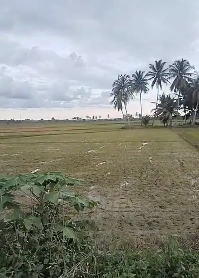 rural landscape, likely a rice paddy, with a few coconut palm trees scattered around. The sky is overcast with grey clouds. In the foreground, there's some low-lying vegetation. The paddy fields appear to be mostly dry, with some signs of recent cultivation. The overall scene has a muted color palette due to the cloudy weather.
