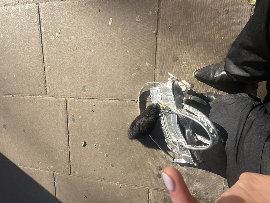 The image depicts a high-angle view of a concrete paved sidewalk in Greater London, United Kingdom, partially obscured by a person's lower body and a handbag. The pavement consists of light grey rectangular slabs, marked by numerous dark stains, dried liquid spots, and scattered small debris, including a single cigarette butt near the top center. A sharp diagonal shadow line bisects the upper left quadrant. In the lower half of the frame, a person is visible from the upper thighs down, wearing black trousers and black pointed-toe boots. A hand, with a fingernail polished in a light pink hue, extends from the bottom left corner, pointing towards the center-right. A metallic silver handbag with visible zipper details, braided handles, and a round emblem is resting on the pavement, situated between the person's legs and the bottom right. Attached to one of the handbag's straps is a black fur bag charm secured by a gold-colored clasp. A white tag hangs from the handbag's side.