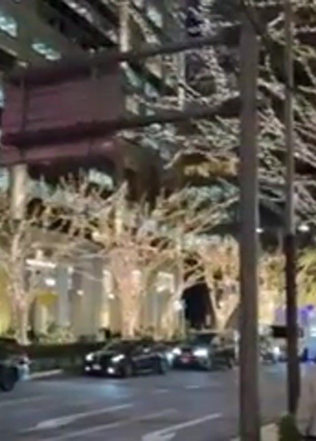street at night illuminated with white lights, likely during a holiday season. Trees along the street are decorated with lights. Tall buildings line the street, some of which have illuminated windows. Several cars drive along the road. People walk along the sidewalks. Street signs are visible. The overall atmosphere is bright and festive.
