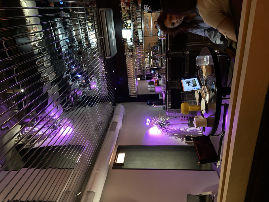 The image depicts the interior of a modern cafe or bar, identified as Double G Coffee, located in Saint Petersburg, Russia. The scene is illuminated by varied lighting, including a prominent purple ambient light illuminating a potted plant and a section of a light-colored wall on the left. Above this wall, a white ventilation duct runs horizontally. A dark, rectangular doorway is also visible on the left. The ceiling is highly reflective, featuring numerous parallel metallic strips that create a distorted, abstract reflection of the room's elements, including bottles, lights, and the bar area. In the mid-ground, a round, dark table is set with several items: a white teapot, a distinctive yellow mushroom-shaped lamp, an open laptop displaying an image on its screen, a smartphone, reading glasses, a pen, a white saucer, a white cup, and a clear glass containing liquid. Two individuals are seated at this table. One person, positioned to the right of the table, has shoulder-length reddish-brown curly hair, wears a light-colored long-sleeved top, and is looking towards the left, appearing to engage with the second person. The second person is in the immediate foreground, their back partially visible, wearing a light-colored garment. In the background on the right, a well-stocked bar features multiple shelves filled with liquor bottles and numerous inverted glasses hanging above the counter. Bar equipment, including espresso machines, is visible on the counter. A person wearing a dark shirt with the text "DOUBLG" (presumably referring to "Double G") is partially visible behind the bar, seemingly a staff member. An air conditioning unit is mounted on the wall above the bar area.