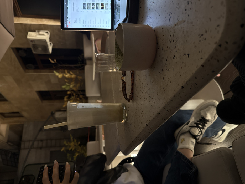The image depicts a nighttime scene at an outdoor or semi-outdoor establishment in Yerevan, Armenia, likely a cafe or restaurant. In the foreground, a light-colored terrazzo-style table occupies the bottom half of the frame. On the table, from left to right, are: a tall, clear plastic cup with a layered beige and white beverage and a light-colored straw; a pair of brown tortoiseshell eyeglasses; a small, clear drinking glass; and a light-colored ceramic cup, possibly off-white or light pink, containing a green substance. To the far right, a silver laptop with an illuminated screen displaying a YouTube interface labeled "Channel content" is open. A person is partially visible on the left, seated at the table. This individual wears a dark jacket over a white garment, blue jeans, white socks with a small yellow embroidered design, and white sneakers with black laces and a black Nike swoosh. Their left hand holds a dark-cased smartphone, facing away from the viewer. The lower legs of another individual in dark pants are visible beneath the table on the right. The background features a warm-toned building facade, possibly stone or stucco, with visible windows and a dark brown door. Two white air conditioning units are mounted on the building wall to the right. Potted plants with yellow foliage are arranged in white rectangular planters. A metal ladder is visible against a darker section of a building in the far left background. Overhead, a portion of a white or light-colored umbrella structure is visible on the far right. The overall lighting is artificial and casts a warm glow across the scene.