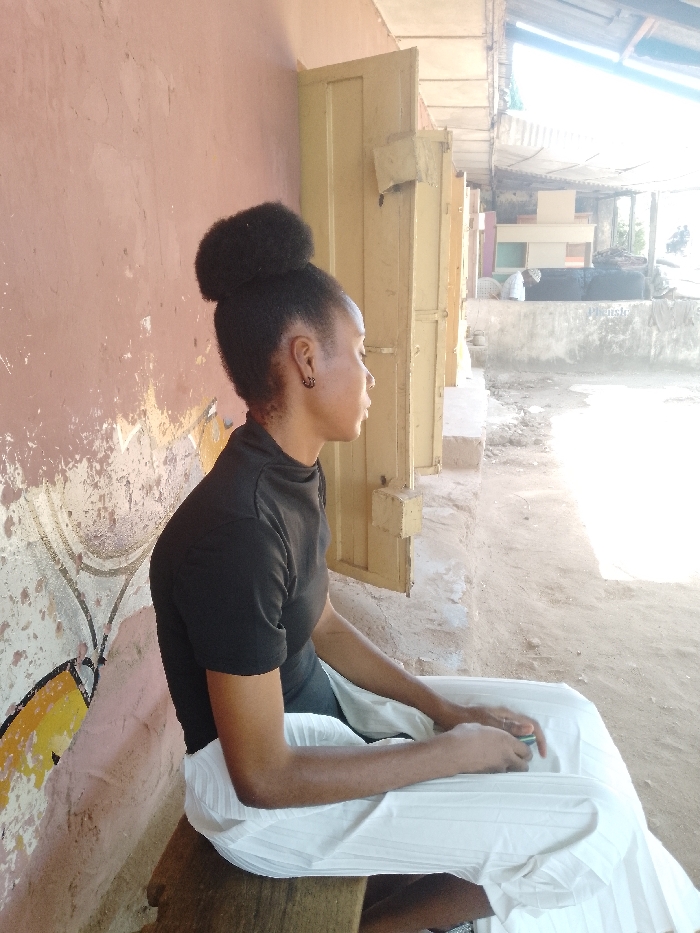 An individual is depicted seated outdoors in Makera, Nigeria, viewed in right profile