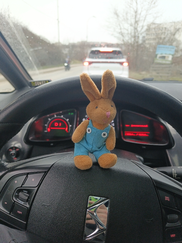 - "A small, brown plush rabbit toy, dressed in light blue overalls with white buttons, is positioned centrally on the black, multi-functional steering wheel of a vehicle" by FM-YVp303, licensed under CC BY 4.0
