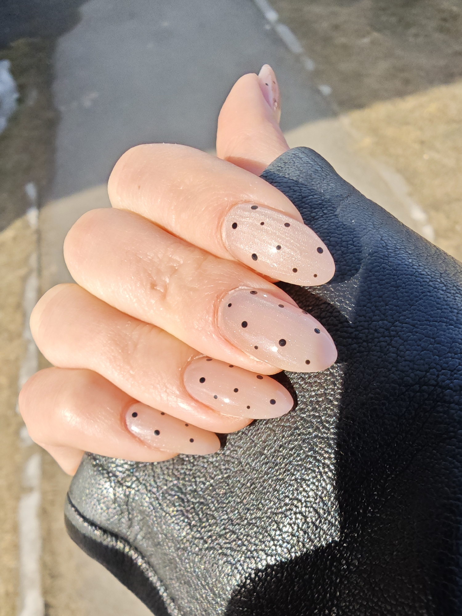 A close-up shows a woman's hand resting on a black, textured leather jacket or glove. The hand is holding the thumb slightly raised. The fingernails are long and almond-shaped, painted with a sheer, light pink or nude color and adorned with small black polka dots. The background features a blurred outdoor setting, with a patch of what appears to be snow or light-colored debris, a gray asphalt surface, and some blurred vegetation. Based on the user's prompt, the location is implied to be in Chaikovsky, Russia. The primary action is the hand resting on the leather garment, showcasing the nail design. The environment is bright and sunny.