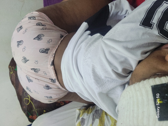 A person is lying down, possibly sleeping, on a bed. They are wearing pink shorts with heart and Mickey Mouse-like head designs, and a white and blue athletic jersey with the number "10" visible. Part of their face is visible near a white ribbed item. The bed has patterned linens, and a phone displaying "Galaxy S21 5G" is near the bottom corner. The person's posture suggests relaxation or sleep.