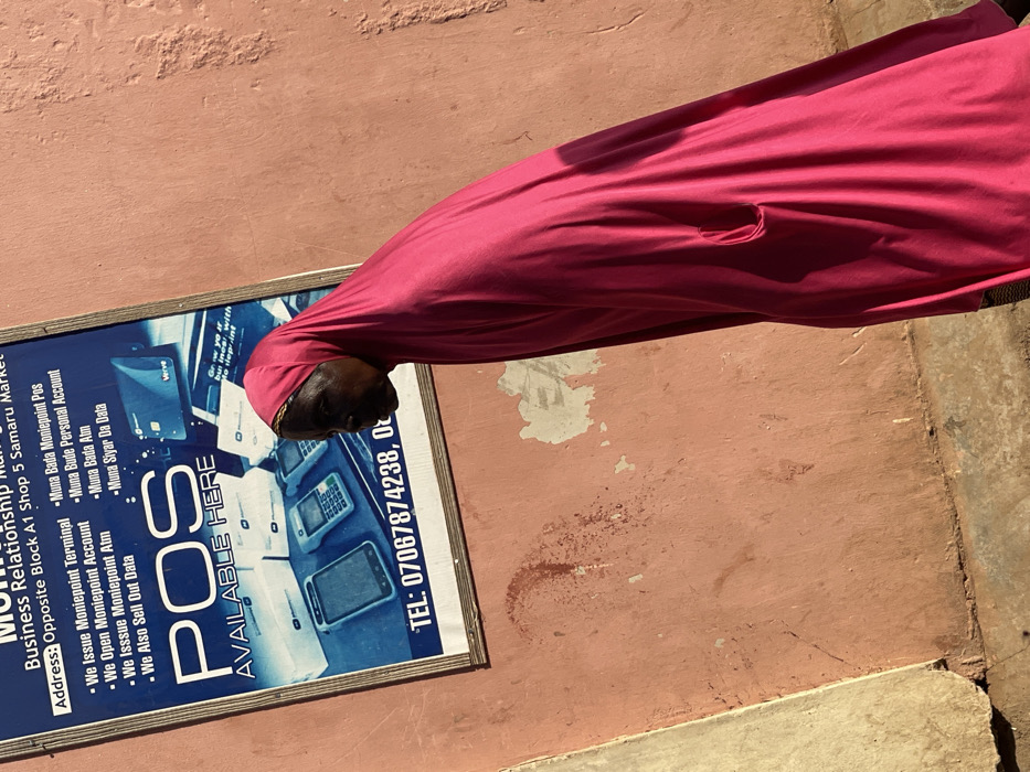 An older woman, dressed in a bright pink full-body covering garment with a patterned head band, is depicted in profile facing left. She appears to be walking or standing next to a reddish-orange textured wall exhibiting peeling paint and discoloration. Mounted on this wall is a large blue and white sign for "MONIEPOINT BUSINESS RELATIONSHIP MANAGEMENT," advertising "POS AVAILABLE HERE" and services such as issuing terminals, opening accounts, providing ATMs, and selling data. The sign also displays images of POS devices and a Verve card, along with a contact number. The location is specified on the sign as "Opposite Block A1 Shop 5 Samaru Market" in Samaru, Nigeria. The scene is brightly illuminated by direct sunlight, casting shadows. A lighter, vertical concrete or stone surface is visible on the far left, and a rough ground surface is at the bottom.