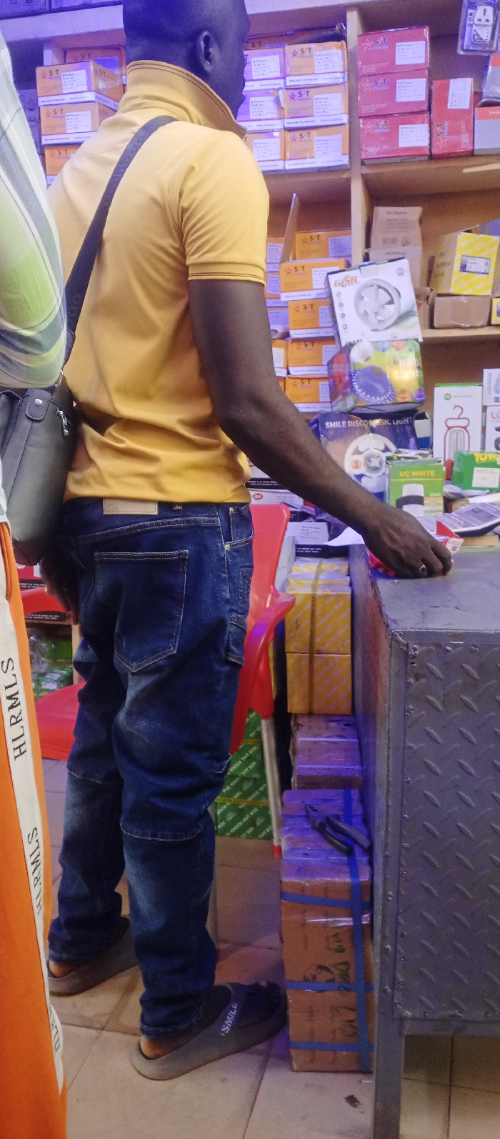 The scene depicts an interior view of a retail establishment, located in the city of Lokoja, Nigeria. An adult male with dark skin is the primary subject, viewed from a three-quarter back angle, slightly turned to his right. He wears a yellow short-sleeved polo shirt with black trim, blue denim jeans, and dark grey slide sandals featuring "SMILE" text on the left foot. A dark grey shoulder bag with a strap traverses his chest. His right arm is extended, with his right hand, adorned with a ring on the ring finger, resting on a dark grey metallic counter exhibiting a diamond plate pattern. To the left, a second individual is partially visible, showing a segment of an orange garment with a vertical white stripe labeled "HLRMLS" and a plaid shirt in green and white tones. The background features wooden shelving densely stocked with various boxed products, including multiple white and red boxes marked with "ST" and a star logo, some specifying "ENGLAND TECHNOLOGY." Other visible items include a boxed circular white fan unit, packaging for a "SMILE DISCO MUSIC LIGHT," and a "UC WHITE" item. A red plastic chair is positioned behind the primary male subject. On the tiled floor adjacent to the counter, several cardboard boxes, some wrapped in yellow paper with blue strapping, are stacked. A pair of pliers rests atop one of these stacks. The lighting appears bright and uniform, with a slight purplish ambient hue.