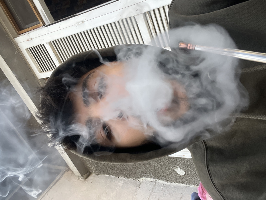 The image displays a close-up, low-angle perspective of a male individual located in the city of Joubar Municipality, Syria. The subject is observed exhaling a substantial cloud of white smoke, originating from his mouth and obscuring the lower half of his face. He is wearing a dark olive-green hooded sweatshirt, with the hood covering his head. His dark eyes and eyebrows are visible above the smoke, directed slightly upwards. A silver-colored hookah hose, featuring a copper-toned mouthpiece, is partially visible in the lower right portion of the frame, extending towards the smoke cloud. The background environment consists of a textured light grey wall on the left, and a white wooden window with closed louvered shutters on the right.