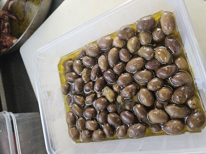 A transparent, rectangular plastic container, possibly a food storage box, occupies the foreground and center of the image. The container is filled with numerous brown to greenish-brown whole olives, submerged in a shallow layer of golden-yellow liquid, consistent with olive oil. The olives exhibit slightly varied sizes and textures, some appearing smooth, others mildly wrinkled. In the upper left background, the upper portion of a second, similar transparent plastic container is partially visible, indicating additional food storage. In the upper right background, the rim and a portion of a metallic pan or bowl are visible, containing a reddish-brown, textured item, possibly meat or seafood, also partially submerged in a liquid. The items rest on a flat, light-colored surface, likely a countertop or cutting board, which extends across the bottom and right side of the frame. The scene is located in Cascais, Portugal. No individuals are present.
