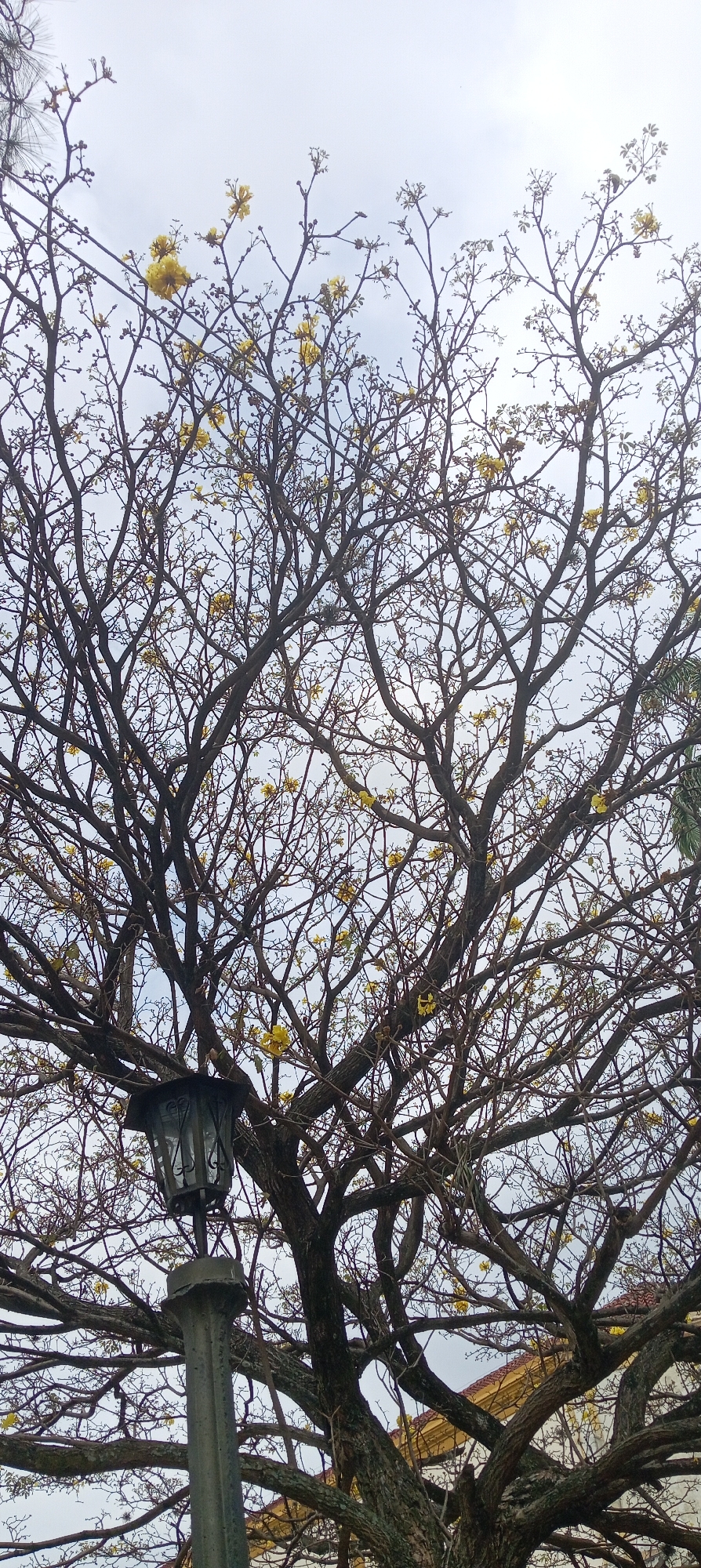 An upward shot captures a tree in Tinaquillo, Venezuela, laden with sparse yellow blossoms against a pale sky. The tree's bare branches form an intricate network, a streetlamp is attached to the lower branches, and the crown obscures a rooftop in the distance. The scene is viewed from below.