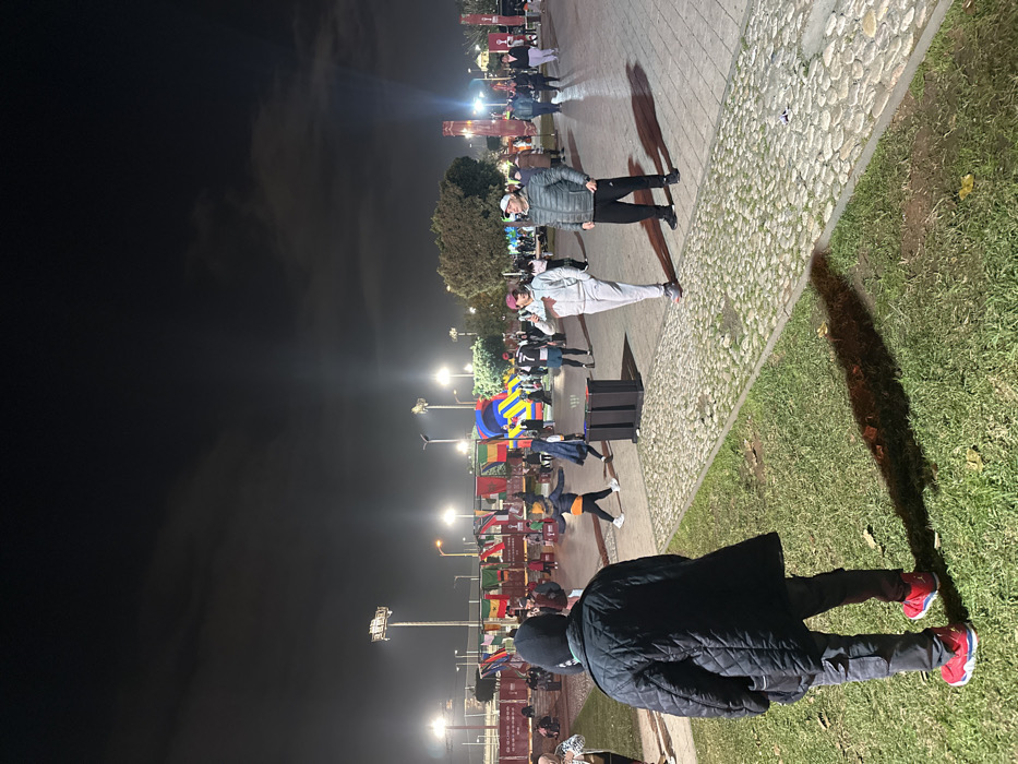 At night, people walk along a lit path next to a grassy area. The path is lined with flags and lights. There is a tree and some colorful structures visible in the background. Shadows of the people are cast onto the pathway. One person in the foreground is wearing red sneakers and a black coat. The sky is dark with clouds.