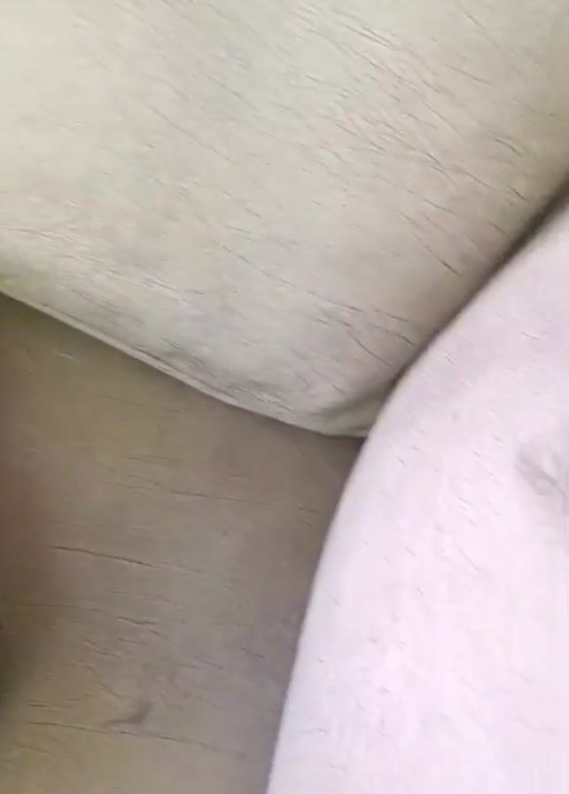 tabby cat lying on a beige surface, potentially a couch or cushion. A hand pets the cat, starting from its back and moving towards its head. The cat appears relaxed, with its eyes mostly closed. The environment appears to be indoors, with a wall visible in the background.