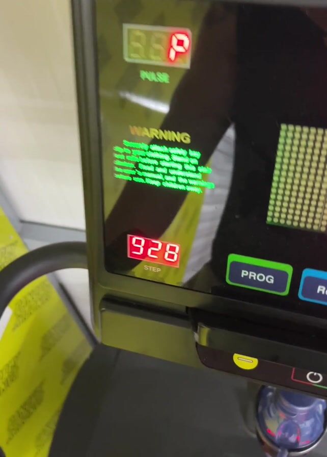 person using a stair stepper exercise machine. The machine's console displays information such as the number of steps taken, pulse, calories burned, and resistance level. The step count increases from 927 to 928 during the brief video. A warning message in green text is visible, along with button options such as "PROG" and "RESUME." The console has a numeric keypad and various function buttons like "MODE," a power button, and "+" and "-" buttons. A water bottle is placed in a holder on the machine, and a TV remote rests nearby.