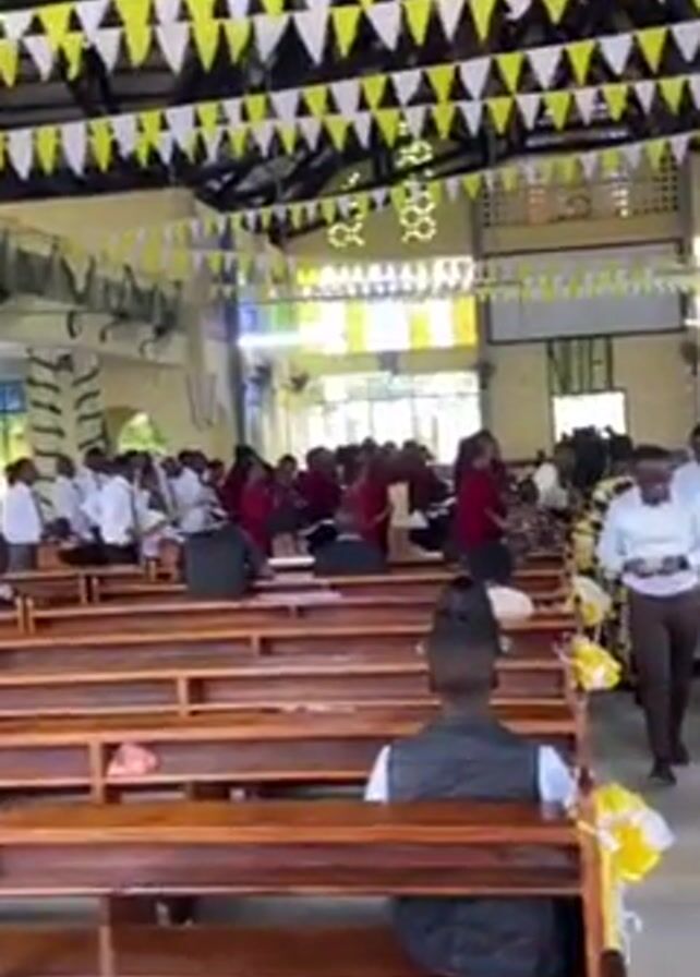 interior of a church or a large hall. Several rows of wooden pews fill the space. A group of people, mostly young, are standing in the center pews. Some are wearing white shirts and ties, while others wear red. They appear to be singing, holding what looks like song sheets. People are moving about, some standing and observing. The ceiling is decorated with rows of yellow and white triangular pennants. The room is well lit, with light streaming through stained-glass windows. There is general movement and activity.