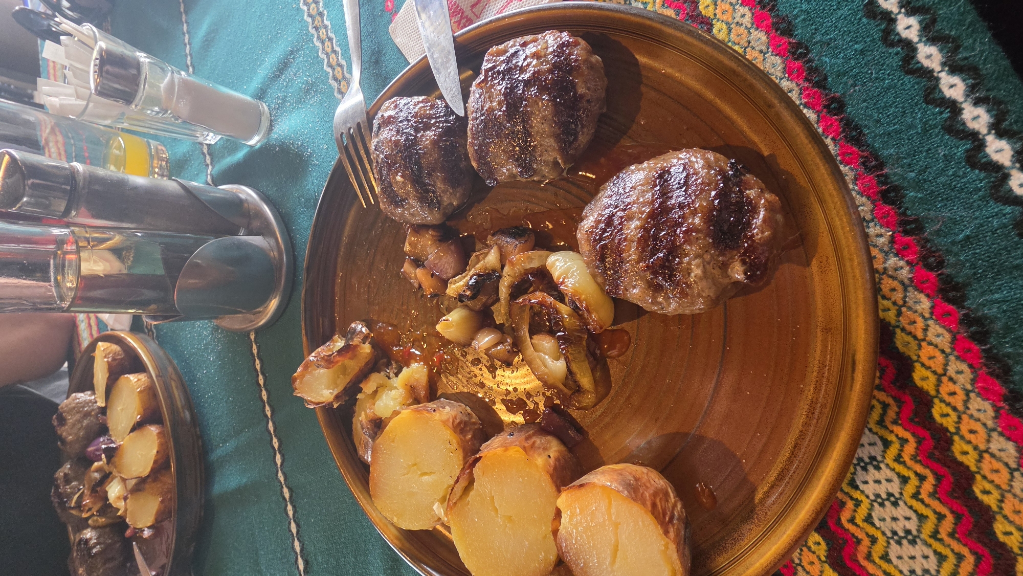 A high-angle shot depicts a meal served on a rustic table, likely in a restaurant, potentially in the city of Arbanassi, Bulgaria. The meal consists of three round, browned meat patties accompanied by cooked potatoes and caramelized onions. The food is presented on a large, circular, earthenware plate with a glossy, brown glaze. To the left of the plate, there is a metal holder containing condiments, including a pepper shaker and salt shaker. Beside the plate, a fork and knife rest. Another smaller bowl of the same food is present to the lower left. The tablecloth beneath the plate has a colorful, patterned design, possibly of Bulgarian origin. The lighting suggests an indoor setting with natural light coming from above. No people are clearly visible, only a sliver of a person is seen in the lower left.