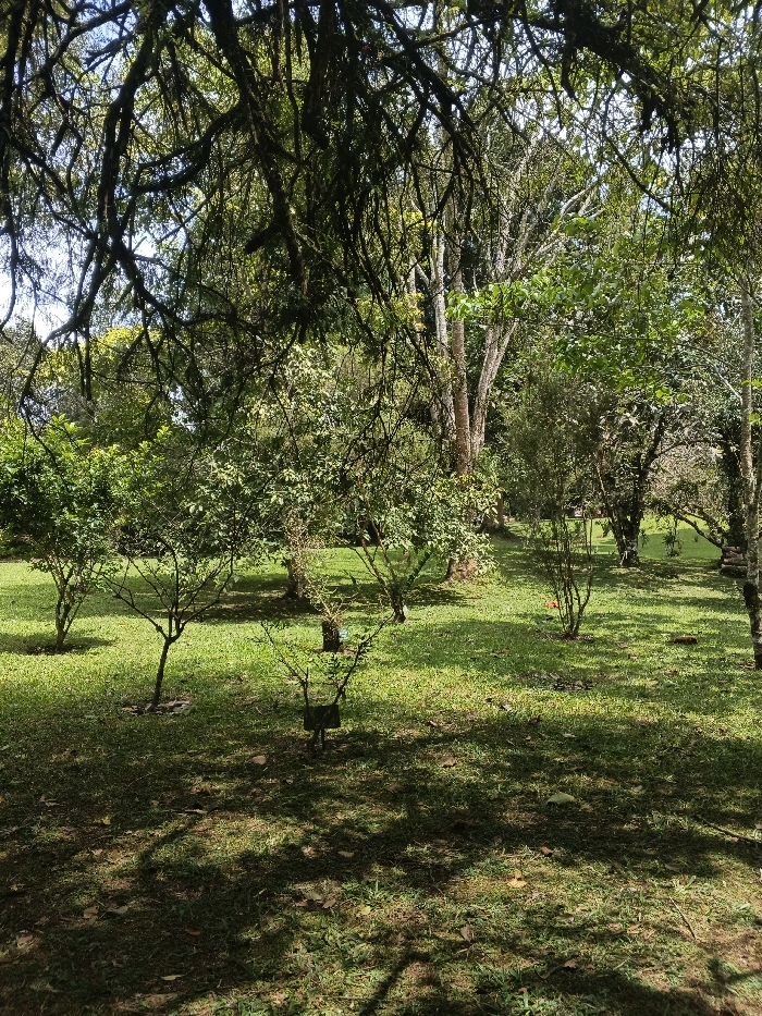 A lush green lawn is dotted with small trees, casting dappled shadows. Mature trees are visible in the background, their branches forming a dense canopy overhead. The light filters through the foliage, creating a mix of sunlit and shaded areas on the grass below. The scene evokes a sense of tranquility and natural beauty.