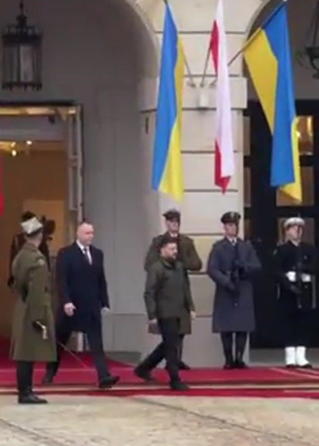 scene outside a building with Polish and Ukrainian flags displayed prominently. Several figures, including what appears to be Volodymir Zelenskyy, exit the building and walk on a red carpet lined with uniformed soldiers. The environment includes cobblestone paving and ornate architecture. The scene appears to be a formal arrival or departure event.