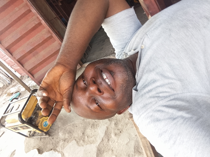 The image portrays an adult male positioned centrally, smiling and looking directly at the camera, in an unidentifiable outdoor area in the city of Unknown, Unknown. He has dark skin, short dark facial hair, and is wearing a light grey short-sleeved collared shirt with a single visible button. His right arm is bent and raised, with his open hand extending into the upper left quadrant of the frame, fingers slightly curled. To the lower left of the man, on the ground, a yellow and black portable generator with a blue circular emblem on its engine is visible. The ground surface consists of light-colored dirt and concrete debris. A small light blue object, possibly a piece of plastic or footwear, lies on the ground near the generator. The background features a reddish-brown corrugated metal structure on the left side and a segment of a light-colored wooden frame on the far right.