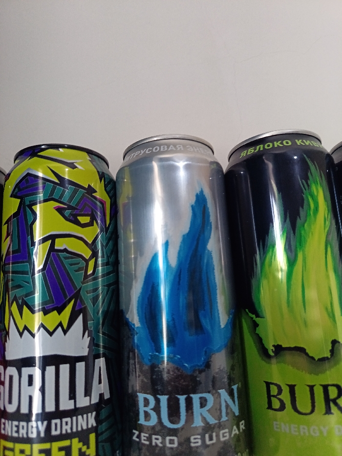 Three energy drink cans are displayed close together. The can on the left is yellow and green, featuring an image resembling a gorilla. The middle can is silver, with a blue flame illustration and "Burn Zero Sugar" text. The can on the right is dark, with a green flame design and "Burn Energy Drink" text. The tops of the cans are slightly visible, each with inscriptions in a language that appears to be Russian.