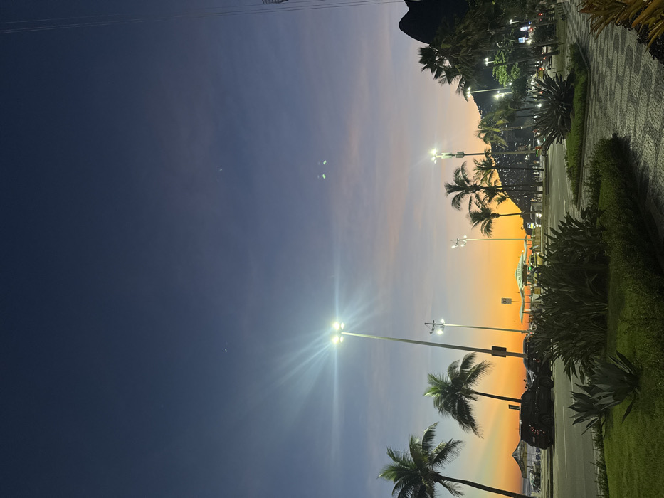 An evening scene depicts a vibrant sunset sky transitioning from deep blue to orange. Silhouetted palm trees and streetlights line a road with parked cars beside a tiled walkway edged by lush greenery. A dark, mountainous shape is visible in the upper right corner against the lighter sky, adding depth to the tropical atmosphere.