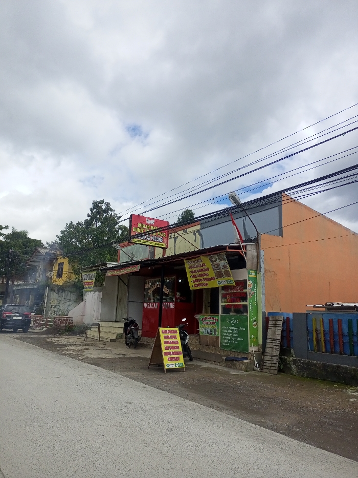 A cloudy day view of a roadside eatery. The building, painted in shades of orange, gray, and red, features signs with Indonesian text. A motorcycle is parked near the entrance. A car is seen in the distance. Power lines cut across the sky. The restaurant appears to be a local establishment serving traditional Indonesian dishes.